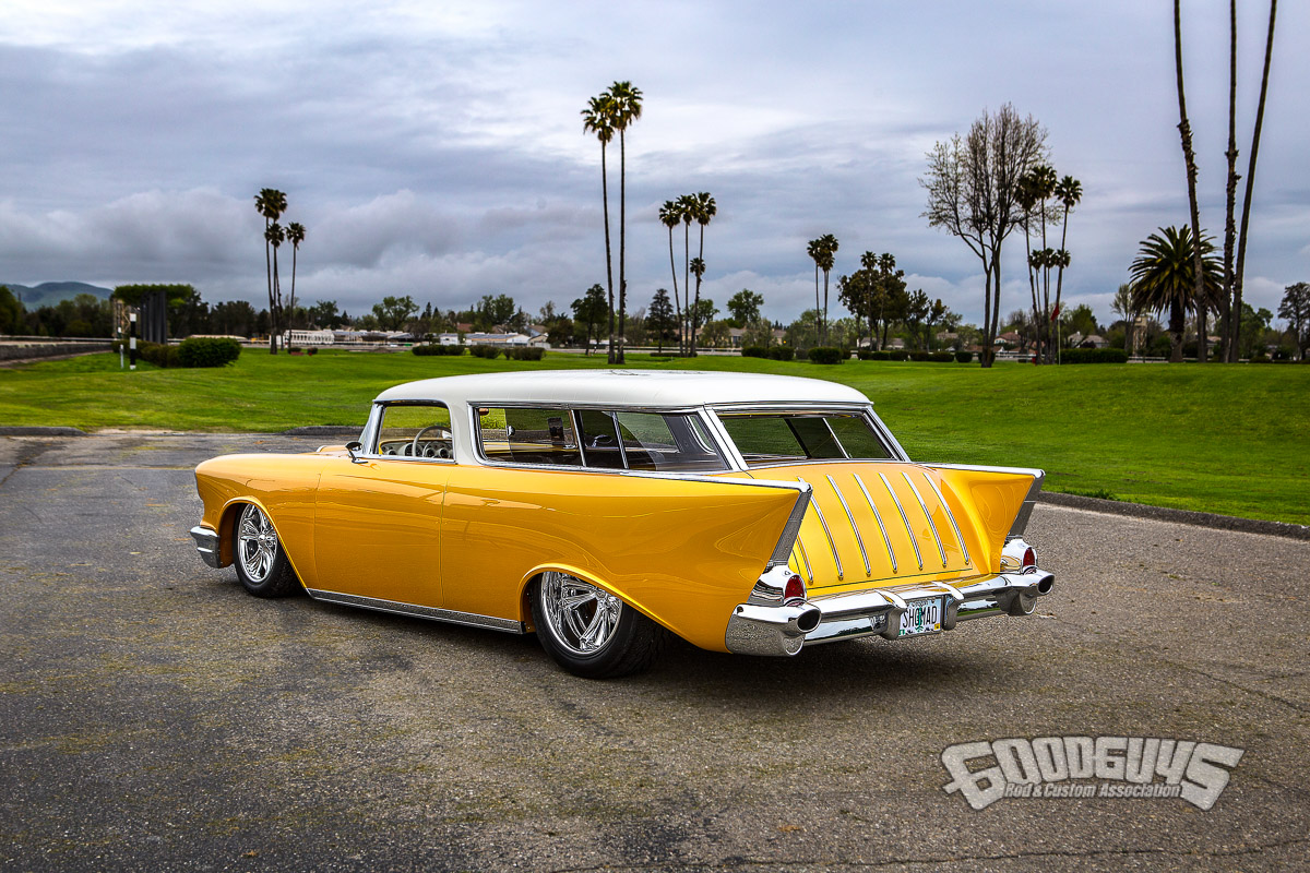 Ron Maier’s breathtaking 1957 Chevy Nomad station wagon “Shomad” was crowned Goodguys 2017 Street Rod Headquarters Custom of the Year yesterday in Pleasanton, CA. . A coach built ’57 Nomad by Oregon’s A & M Deluxe Customs, it was the first Goodguys Top 12 award for both owner and builder. A project that began the year of global financial meltdown and built nearly from scratch, the Shomad incorporates restyled lines, big power and plenty of bling.