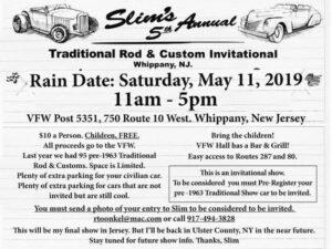 Picture perfect day for the rain out at Slim’s 5th Annual Traditional Rod & Custom Invitational at VFW Hall in Whippany, NJ. All the car and trucks by invitation with all the proceeds going to the VFW. Always good seeing my fellow cars guys from PA, CT & NJ showing their support. Enjoy the pics!