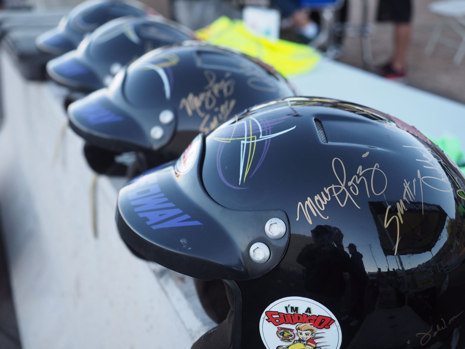 Speedway Motors, the official Speed Shop of Goodguys, has graciously donated this year to the Austin Hatcher Foundation AutoCross for Kids throughout the event season and now they are taking that one step further! In December, Speedway Motors and Goodguys will auction off the four autographed Duel in the Desert helmets from the Goodguys 19th Southwest Nationals! These special helmets, autographed by Three time Duel in the Desert AutoCross Champion, Danny Popp, as well two time Indy 500 winner, Al Unser, Jr and 9 Time Pikes Peak Hill Climb champion, Robby Unser, Brian Hobaugh, SCCA Solo Champion, Mary Pozzi, Bret Voelkel, Ryan “Captain America” Matthews and the remaining competitors are up for grabs to four lucky bidders!