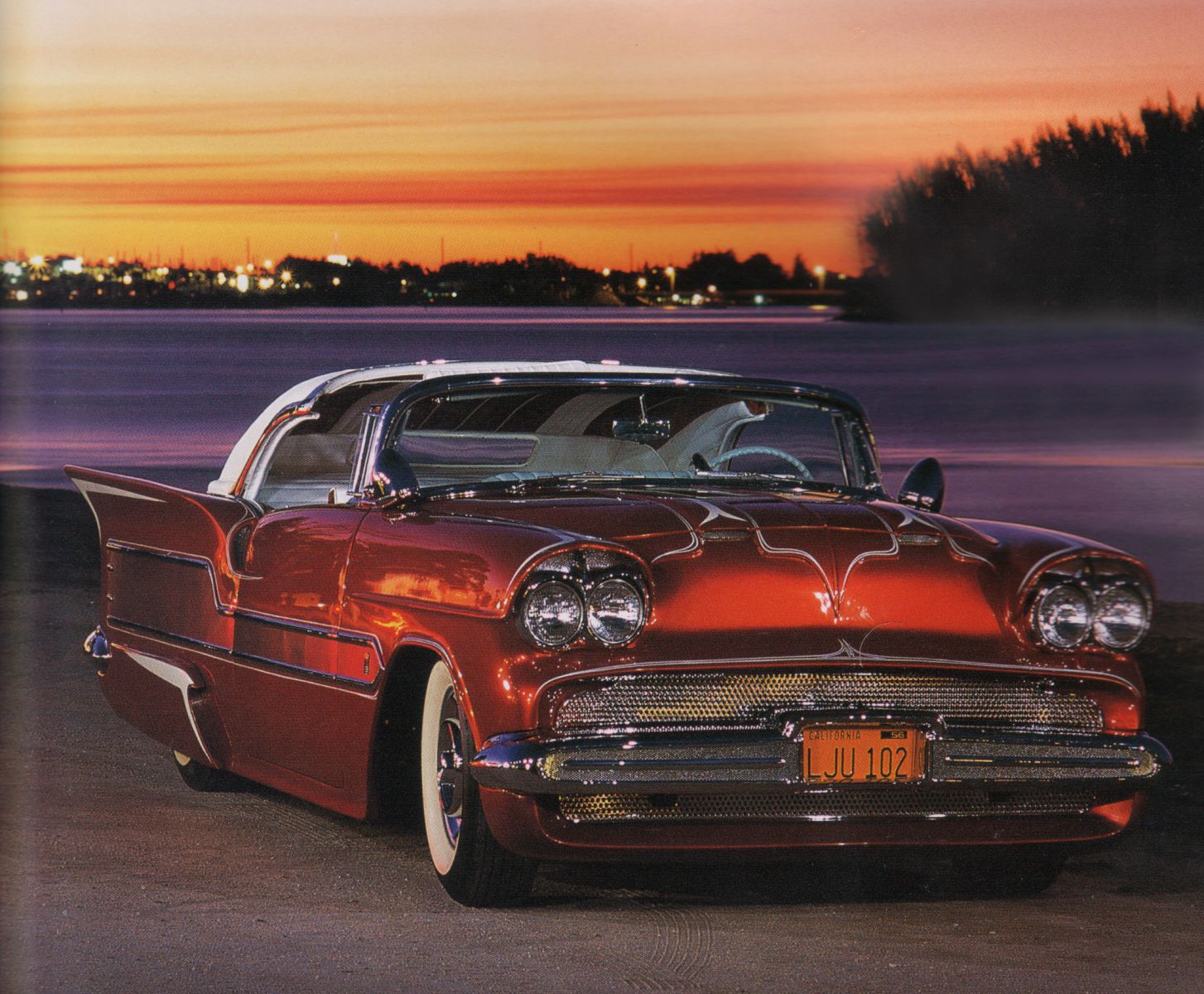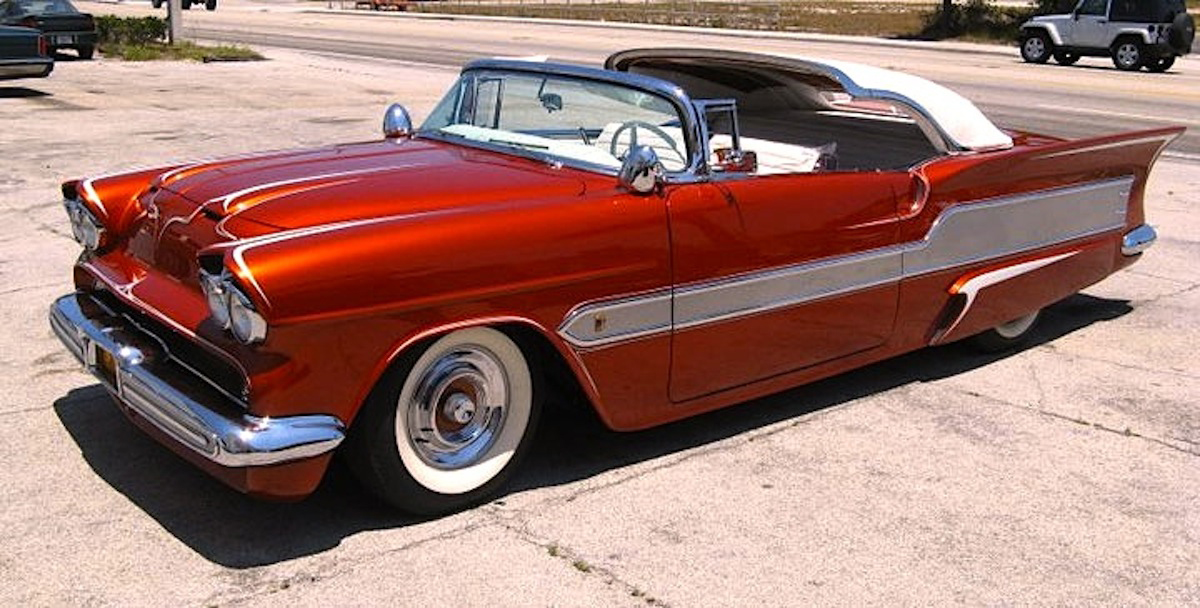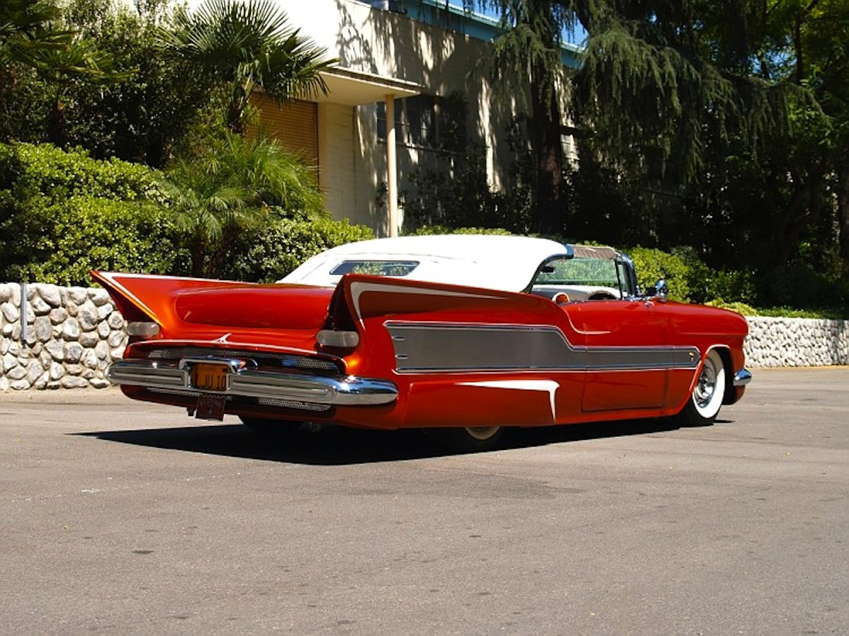 Is this the tail end of a 1955 Bel Air? The fins were swiped from a Studebaker Hawk, while the taillights were created by Bob Hirohata. The bumpers were created using 1957 DeSoto and ’57 Oldsmobile bumpers.