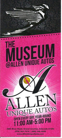 Tammy Allen’s Car Museum at Allen Unique Autos is located at 2285 River Road, Grand Junction, Colorado 81505. Follow these simple directions to get to the museum from anywhere in Grand Junction