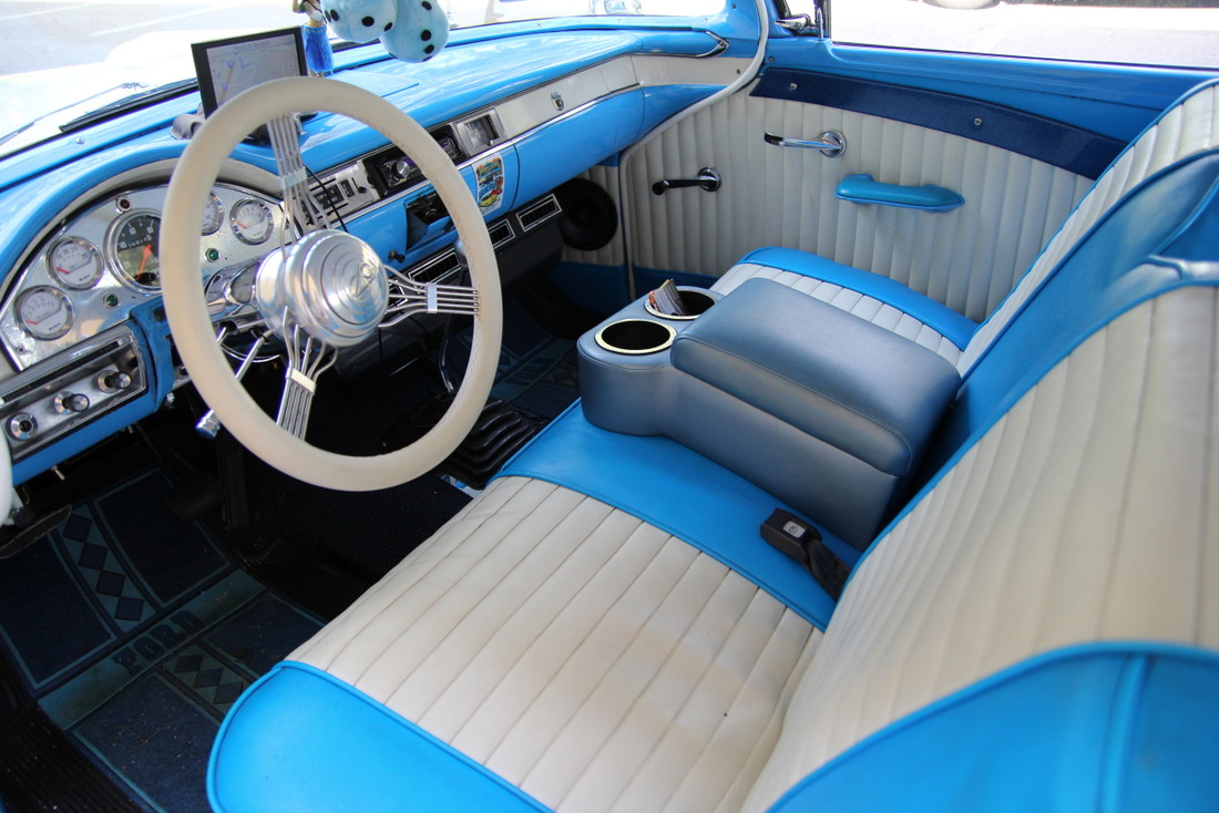 Fred said that while it was a driver, he had to replace the trans with a Ford AOD Transmission ( a three speed with overdrive). While the original engine was long gone, in its place is now a 1974 302cu in engine. Power steering was added next as well as disc brakes up front with 4 piston Wildwood calipers. A LeCarra “Banjo” Style steering wheel was added too for its eye appeal. 15 inch wheels (Legends) were added all around shod with P215/75R15’s and Cokers “wide whites” to complete that 50’s theme. New carpet inside, a Tilt column, as well as a Vintage A/C unit updated the creature comforts. A Kenwood stereo CD, Sirius XM and new speakers (Alpine) helps him listen to those golden oldies while cruising around.