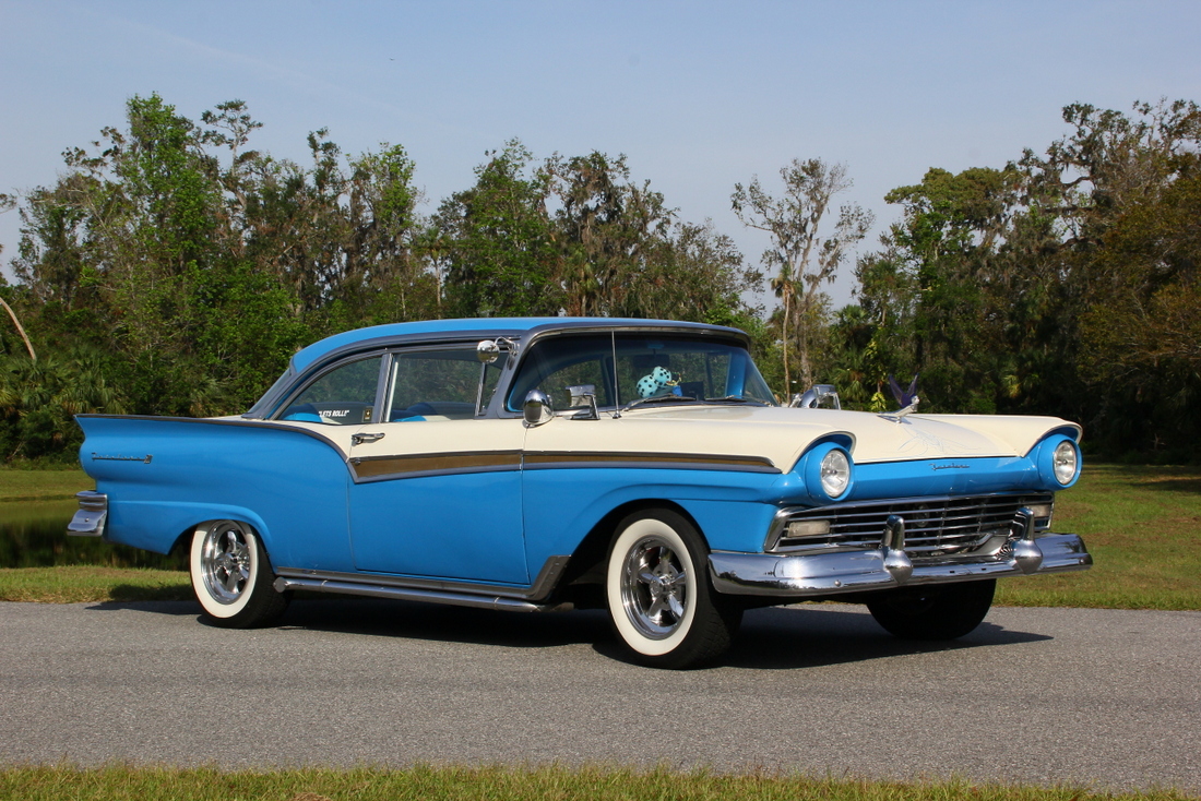 The mainstream Ford line-up of cars grew larger in 1957, although they still retained the single headlamp but were unmistakable with their long tail-fins and rear quarters. The Fairlane 500, like this one, was Fords top-of-the-line model.
