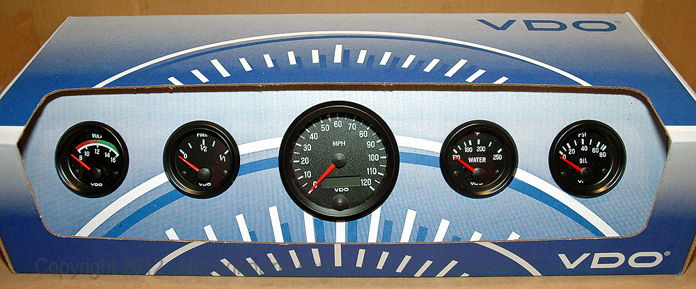 Since I was replacing all but the fuel gauge I chose to buy the five-gauge kit instead of buying individual gauges separately. This is the new VDO Cockpit series kit with 3-1/8 inch programmable speedometer and a GM Hall-Effect sensor for my Turbo 400, Switch-Pitch Buick transmission. Kit can be ordered with a 3-3/8 inch diameter speedometer and connections for other transmission applications.