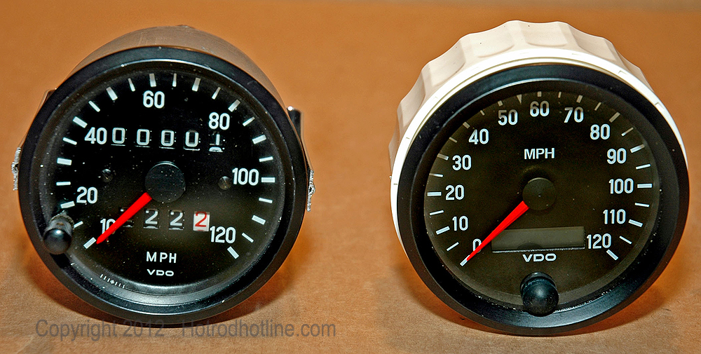 Mechanical speedometer requires a drive cable that runs from behind the dash out to the connection on the transmission. Then the gears have to be changed to compensate for any variation in tire size or other changes made that differ from the original vehicles specifications. The electronic speedometer is fully programmable by the owner and connects via a simple three-wire cable attached to a Hall-Effect sensor installed on the transmission.