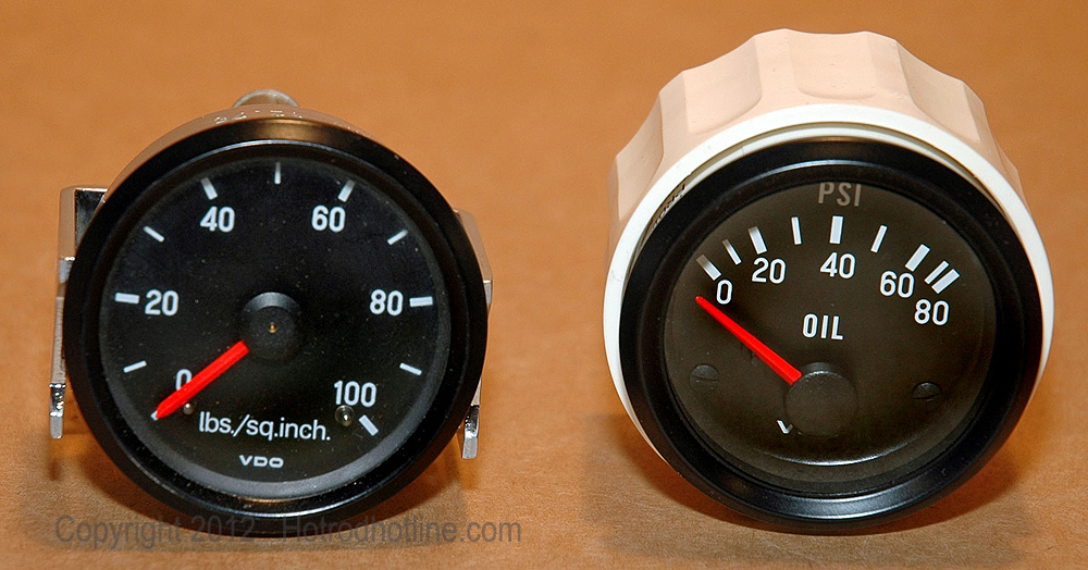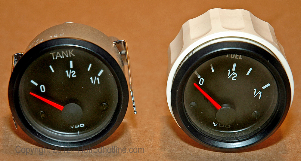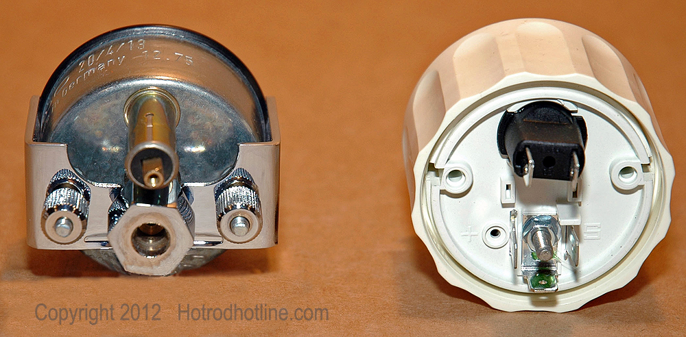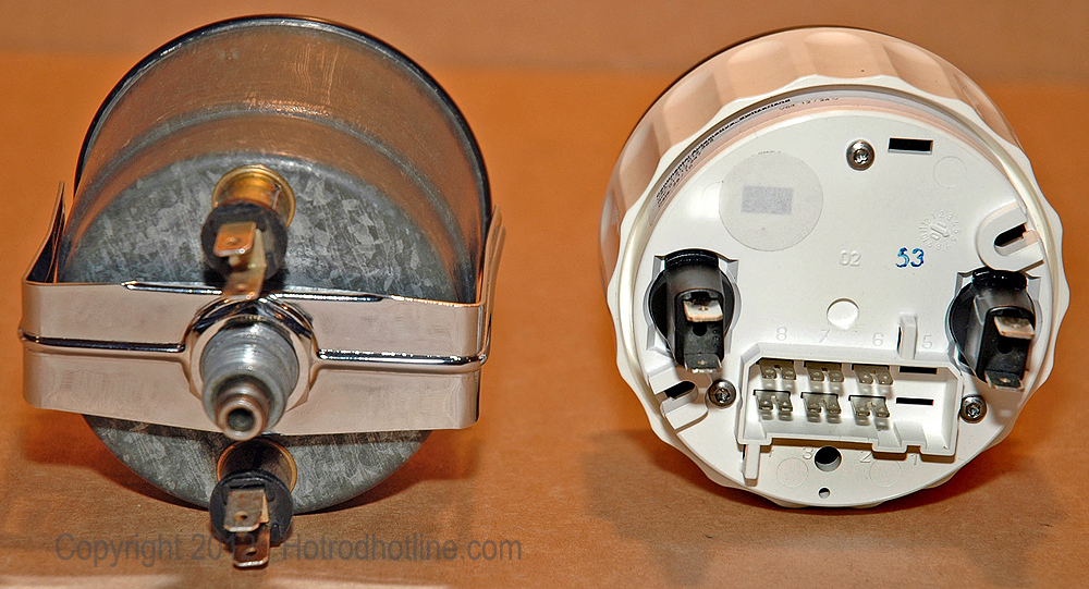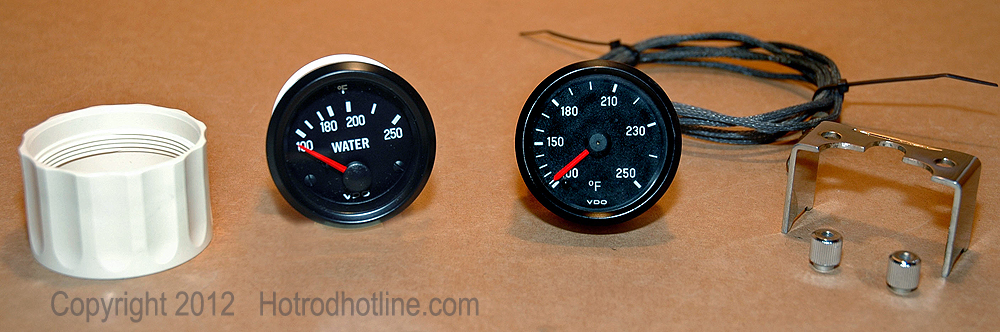 The old and new water temperature gauges both look the same except for the change in the sweep of the needle across the face instead of in a circular motion. Mounting is different with the threaded VDO Spin-Lok clamp instead of the U-clamp for the old style gauges.