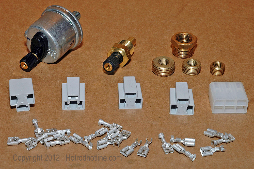 The new VDO gauge kit included an oil pressure sender, water temperature sender, brass thread-adapters for a variety of possible applications, four connectors for the gauges, one connector for the electronic speedometer and an assortment of terminals needed to complete the connections.