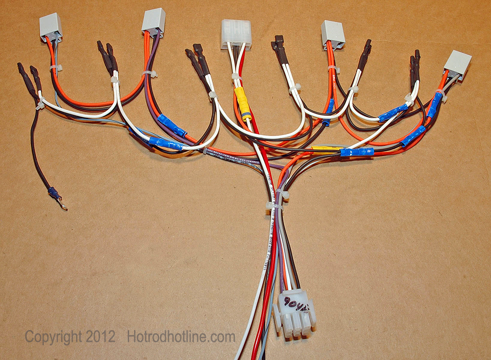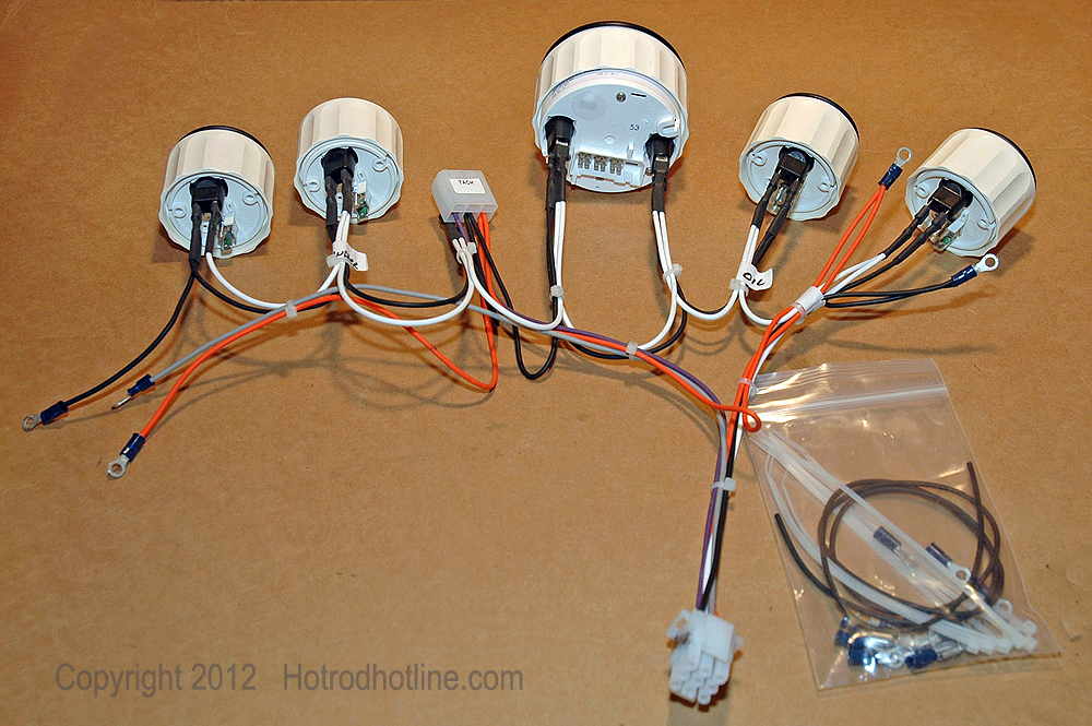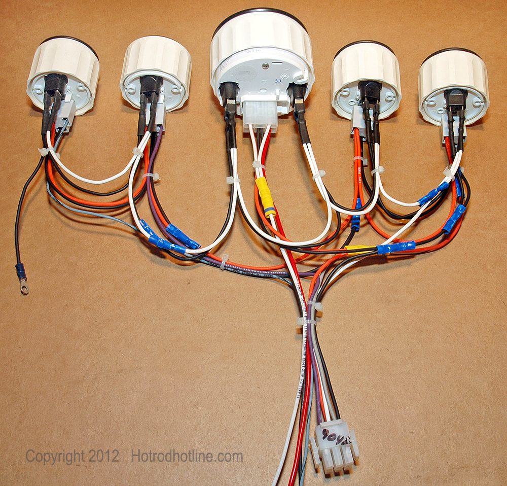 This photo shows the harness connected to the gauges on the bench because it would be difficult to see how the connections were made after the gauges are mounted into the dash. Instructions included with the gauges and harness kit tell anyone with some basic wiring knowledge how to make the necessary connections.