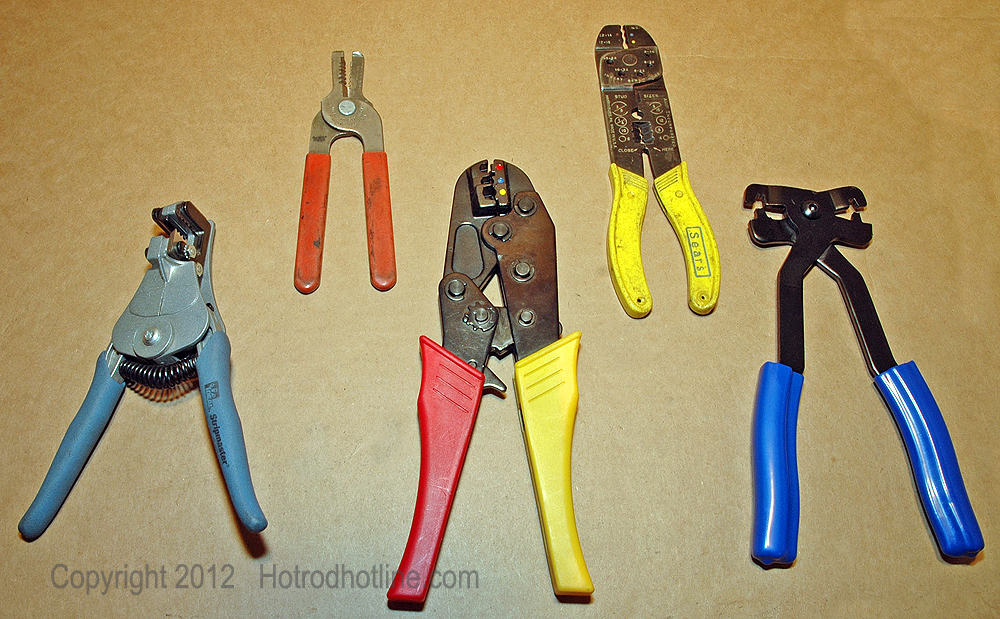 Stripping the insulation on the wires and making crimp connections correctly is critical to creating a safe and functional electrical system. At the left are two wire-stripping tools. One is a more precise tool (blue) that strips a variety of wire sizes without cutting any strands and the other one (red) is a less expensive tool that requires more care when stripping insulation to avoid wire damage. The three crimping tools shown are: a precise crimper with a controlled ratcheting crimp, cheap general-purpose crimper/cutter and a specialty crimper for making crimps on connectors that insert into connector plugs.