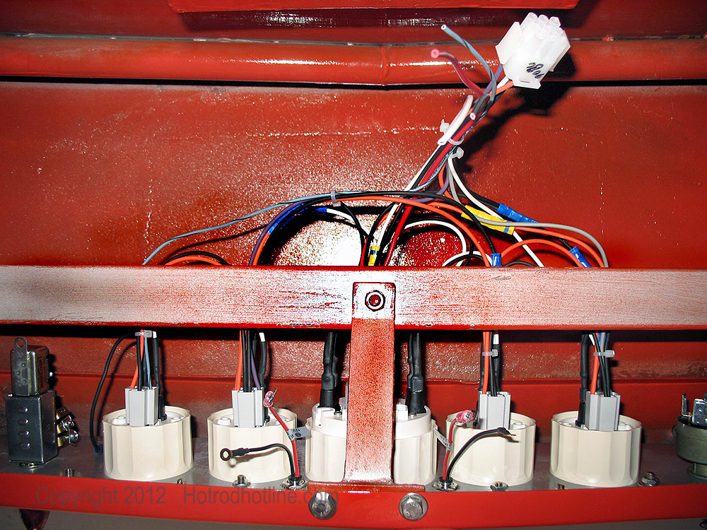 This shot up under the dash shows the gauge harness installed onto the mounted gauges. Spade-connectors make the installation easier and allow for future maintenance without removing everything, if necessary.