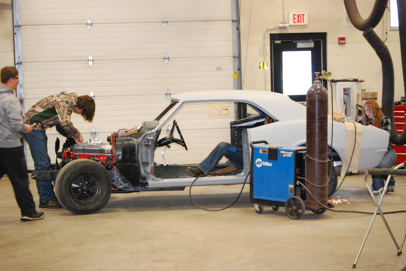 Brittney’s dad Pete Van Dyke is a big time car collector. While some of the other students aren’t really into cars, she’s anxious to learn the skills she can use to help her dad fix cars. She did a lot of sanding on the Camaro, which at this point is a rolling body tub with a frame, wheels, engine and gray primer paint.