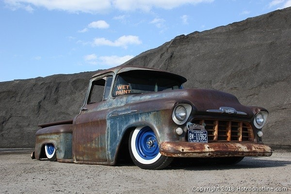 This truck is a 1956 “Task Force Series” Chevy. It was the first year for the new body style. A “wrap-around” windshield — a truck industry first – and the optional wrap-around rear window, as this one has, were all new. It also had a 12 volt electrical system that was new for ’56. This was the only year for the seven-foot bed length. Fenders had single headlights and a one-piece emblem mounted below the horizontal line on the fender. There was only one tail-light, on one side no less, and they upgraded that to dual 1959 Cadillac lenses.