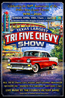 Texas largest exclusive '55-'57 Chevy car, truck and Corvette show, this year celebrating host Dallas Area Classic Chevys 50th Anniversary! Held at Reliable Chevrolet, 800 N Central Expressway in Richardson, there is NO ENTRY FEE, Favorite Pick Awards, door prizes, food, birthday cake and LIVE music from the Cosmo's Factory Band and much MORE! All '55-'57 Chevys welcomed - show, patina, projects, daily drivers, race cars - if it's a Chevy made in 1955, 1956 or 1957 BRING IT! We want a big Tri Five party to celebrate the club's Golden Anniversary! info at DallasClassicChevy.com